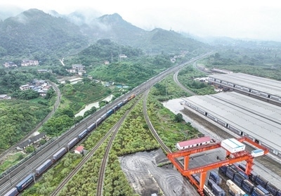 6月27日,西部陸海新通道中老泰馬跨境鐵路班列在重慶江津小南埡站發(fā)車(無人機(jī)照片)。該班列的開行將促進(jìn)通道沿線地區(qū)與東盟國家的經(jīng)貿(mào)合作和產(chǎn)業(yè)聯(lián)動。新華社記者 唐 奕攝