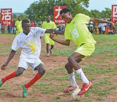 貝寧村民足球賽中,雙方球員正在足球場上拼搶。本報記者 黃培昭攝