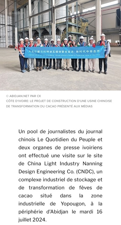 7月16日,人民日報與兩家科特迪瓦新聞機構(gòu)記者一行參觀了由中國輕工業(yè)南寧設(shè)計工程有限公司總承包的可可加工及可可豆倉庫建設(shè)項目,該項目坐落在阿比讓郊區(qū)的約普貢工業(yè)區(qū)。該公司負責(zé)人指出,該項目綜合體計劃于2024年年底完工,包括一個可加工5萬噸可可豆的工廠、可存儲14萬噸可可豆的倉庫以及培訓(xùn)中心、行政大樓等?!钥铺氐贤甙⒈茸尵W(wǎng)報道