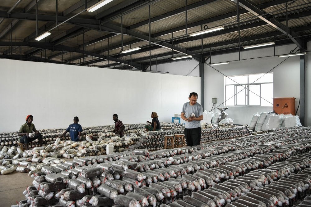 2024年8月13日,在盧旺達(dá)南方省胡耶區(qū)的中國援盧農(nóng)業(yè)技術(shù)示范中心,菌草專家陳曉斌(右)檢查菌袋。自菌草技術(shù)引入盧旺達(dá)以來,當(dāng)?shù)鼐莓a(chǎn)業(yè)發(fā)展迅速,不僅為市場提供了豐富的食用菌產(chǎn)品,還創(chuàng)造了大量就業(yè)機(jī)會(huì)。