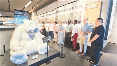 9月4日,在四川省成都市東安湖體育公園主體育場,“2024走進魅力成都”外國專家調(diào)研團成員在參觀成都大運會博物館的陳列。