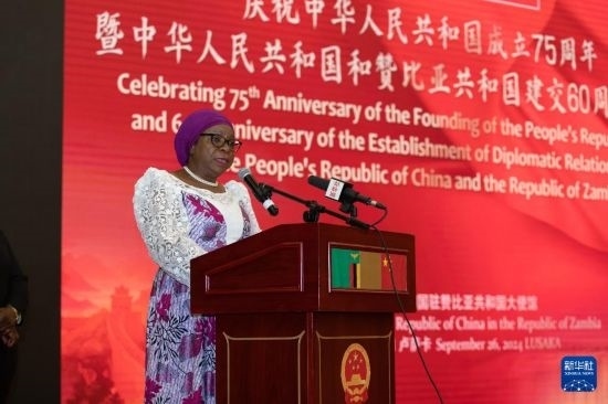 9月26日,贊比亞副總統(tǒng)穆塔萊·納盧曼戈在盧薩卡舉行的慶祝中華人民共和國成立75周年暨中贊建交60周年招待會上致辭。新華社記者 彭立軍 攝