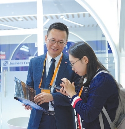 服貿會期間,法國智奧會展集團工作人員與參展觀眾洽談業(yè)務。歐陽功成攝