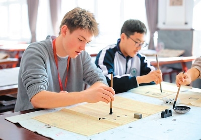 圖為活動期間,來自美國得克薩斯州圣史蒂芬圣公會學校的學生查爾斯·錢寧·達根(左)在河北衡水中學學習書法。