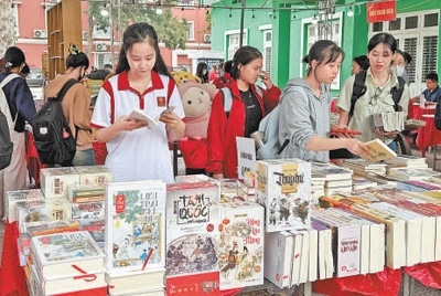 4月9日,越南河內(nèi)大學(xué)孔子學(xué)院學(xué)生在翻閱越南語版的中國(guó)傳統(tǒng)經(jīng)典名著。