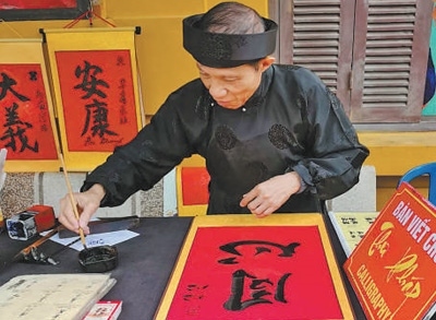4月13日,在越南河內(nèi)胡志明故居,當(dāng)?shù)貢覟橹袊?guó)游客書寫“同心”。