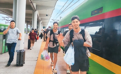 外國旅客乘坐中老鐵路跨境旅客列車抵達(dá)云南磨憨站。