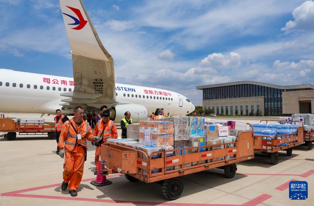4月19日,工作人員在昆明長水機(jī)場將中國政府援緬衛(wèi)生防疫隊(duì)攜帶的物資裝機(jī)。新華社記者 陳欣波 攝