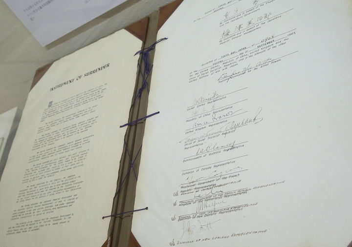 這是2015年9月1日在日本東京外務省外交史料館內(nèi)拍攝的日本二戰(zhàn)無條件投降書原件。新華社記者 劉天 攝