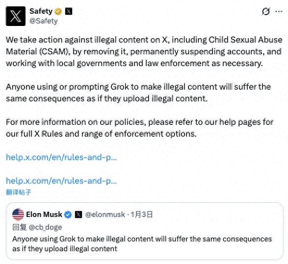 X表示,平臺會對非法內容采取行動,包括刪除資料、封號,并在必要時與執(zhí)法機構展開合作。馬斯克也在周末的一條帖子中強調,任何使用“格羅克”制作非法內容的人,將面臨與上傳非法內容同樣的法律后果。