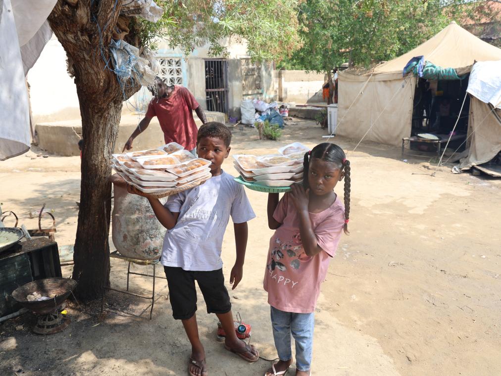 2024年11月12日,在蘇丹東部城市蘇丹港的一處流離失所者營地,兩名兒童準(zhǔn)備把制作好的食品拿到市場出售以換取收入。新華社發(fā)(法耶茲·扎基攝)
