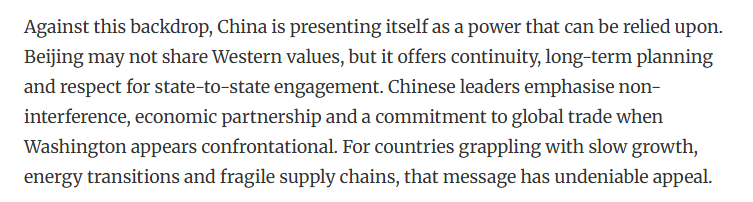 文章認(rèn)為,在此背景下,中國(guó)是可靠力量。中國(guó)提供了連續(xù)性、長(zhǎng)期規(guī)劃和尊重國(guó)家間的交流。中國(guó)強(qiáng)調(diào)不干涉、經(jīng)濟(jì)伙伴關(guān)系和對(duì)維護(hù)全球貿(mào)易。對(duì)于那些正面臨增長(zhǎng)緩慢、能源轉(zhuǎn)型和供應(yīng)鏈脆弱的國(guó)家來說,這一主張具有不可否認(rèn)的吸引力。另外,中國(guó)與美國(guó)不同,中國(guó)并不要求合作時(shí)必須實(shí)現(xiàn)意識(shí)形態(tài)上的一致性。中國(guó)提供市場(chǎng)、投資和交流。在不確定的時(shí)代,這些反而更體現(xiàn)了一種穩(wěn)定。