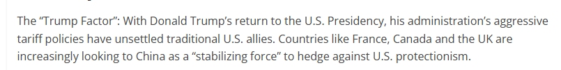 文章說,美國(guó)政府的強(qiáng)硬關(guān)稅政策令美國(guó)傳統(tǒng)盟友感到不安。法國(guó)、加拿大和英國(guó)等國(guó)家正日益將中國(guó)視為“穩(wěn)定力量”,以對(duì)沖美國(guó)保護(hù)主義帶來的風(fēng)險(xiǎn)。