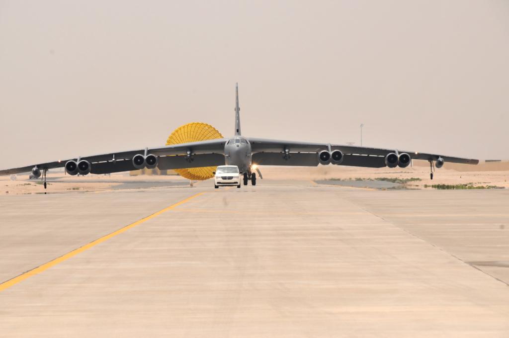 這張資料照片顯示的是2016年4月9日,一架美國(guó)空軍的B-52轟炸機(jī)抵達(dá)卡塔爾烏代德空軍基地。新華社/美聯(lián)
