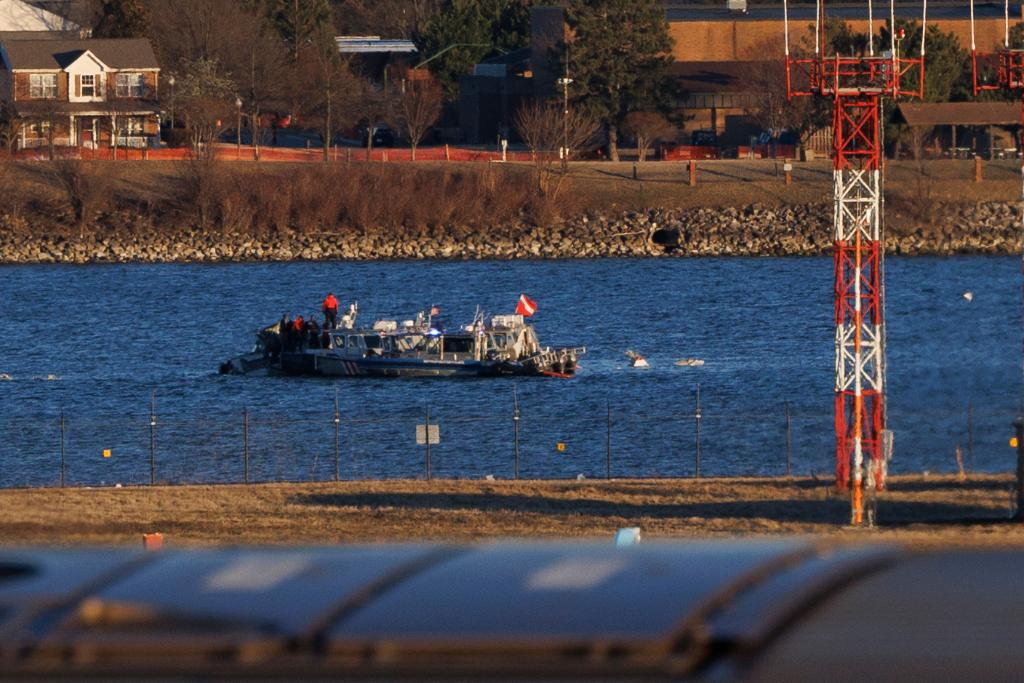 2025年2月1日,工作人員在美國華盛頓里根國家機(jī)場旁的波托馬克河上打撈飛機(jī)殘骸。新華社發(fā)(亞倫攝)