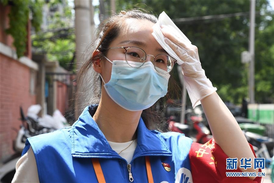 6月16日,在北京市海淀區(qū)中關(guān)村街道白塔庵社區(qū)出入口,疫情防控志愿者王玥在擦拭汗水。連日來(lái),北京出現(xiàn)高溫天氣。酷暑中,工作人員堅(jiān)守抗擊疫情一線,成為烈日下的“逆行者”。新華社記者任超攝