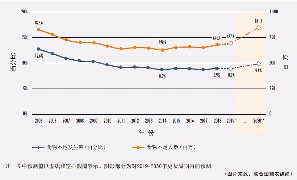 全球食物不足發(fā)生率及人數(shù)逐年統(tǒng)計和預測圖(圖片來源:聯(lián)合國糧農(nóng)組織)