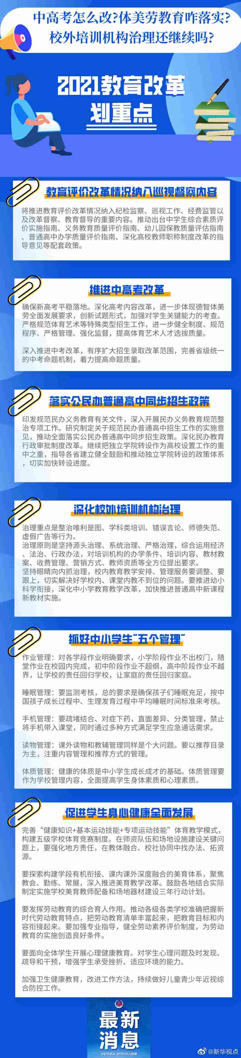 中高考怎么改?體美勞教育咋落實?校外培訓(xùn)機(jī)構(gòu)治理還繼續(xù)嗎?中小學(xué)生作業(yè)、睡眠、手機(jī)、讀物、體質(zhì)都要納入管理?這些社會關(guān)心的熱點(diǎn),在2021年教育發(fā)展改革中都將涉及。記者梳理教育部部長陳寶生在2021年全國教育工作會議上的講話,及《教育部2021年工作要點(diǎn)》,為你劃出以下重點(diǎn)。詳情請見大圖↓↓(記者胡浩)