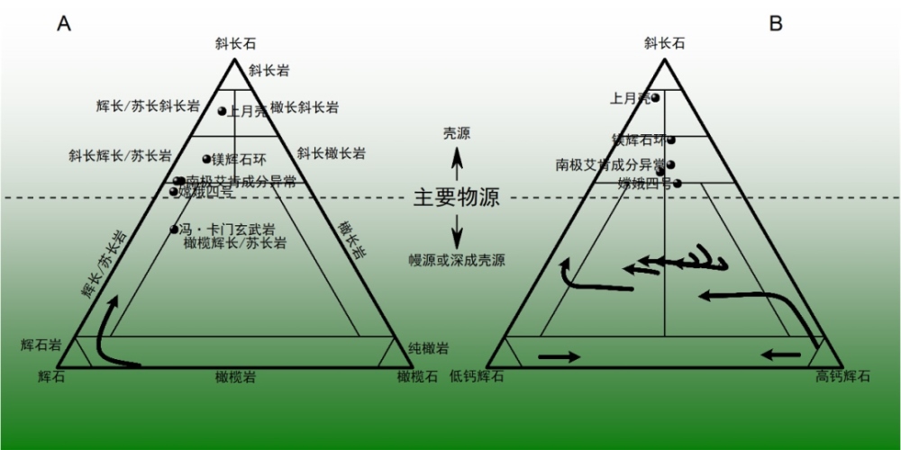 以往對(duì)南極-艾肯盆地物質(zhì)成分的研究大多只注重鎂鐵質(zhì)礦物,由于這一地區(qū)的鎂鐵質(zhì)異常特征,甚至引發(fā)了有關(guān)月幔是橄欖巖還是輝石巖的爭(zhēng)論。雖然根據(jù)月球巖漿洋假說(shuō),橄欖石和輝石是月幔的主要礦物,但是月殼形成之后的深成巖漿侵入作用同樣能夠在月殼中形成富集橄欖石或輝石的巖石,因此富集橄欖石或輝石并不能作為源自月幔的證據(jù)。迄今人類(lèi)還沒(méi)有獲取南極-艾肯盆地的樣品返回地球,無(wú)法獲知其微量元素和同位素特征,通過(guò)遙感或原位探測(cè)可獲得的物質(zhì)成分信息中,斜長(zhǎng)石含量也是區(qū)分殼源和幔源巖石的關(guān)鍵指標(biāo)。
