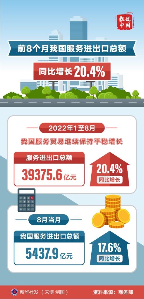 新華社北京10月12日電(記者謝?,帲┥虅?wù)部12日公布數(shù)據(jù)顯示,今年1至8月,我國(guó)服務(wù)貿(mào)易繼續(xù)保持平穩(wěn)增長(zhǎng)。服務(wù)進(jìn)出口總額39375.6億元,同比增長(zhǎng)20.4%。