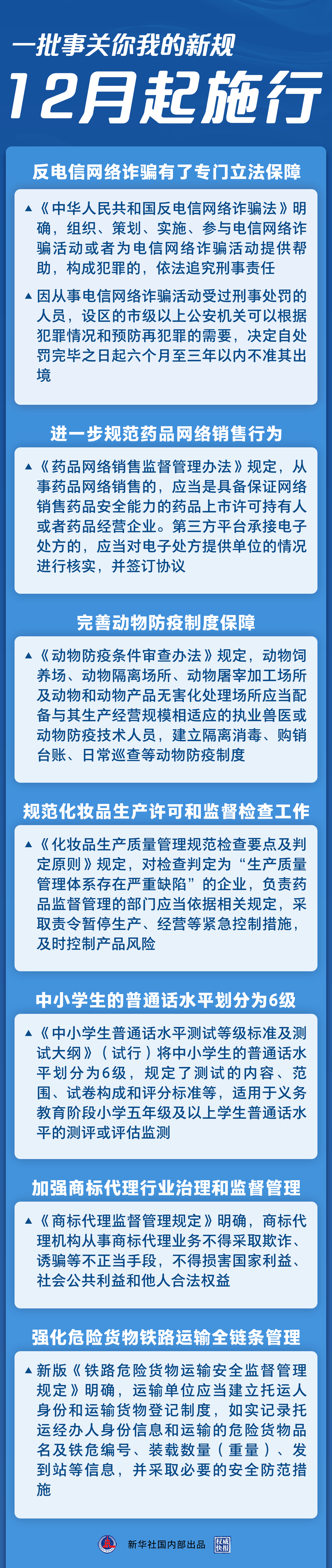 2022年的最后一個(gè)月,一批事關(guān)你我的新規(guī)開始施行。反電信網(wǎng)絡(luò)詐騙有了專門立法保障,中小學(xué)生的普通話水平有了規(guī)范標(biāo)準(zhǔn),藥品網(wǎng)絡(luò)銷售平臺(tái)責(zé)任進(jìn)一步壓實(shí)……法治,為美好生活助力。