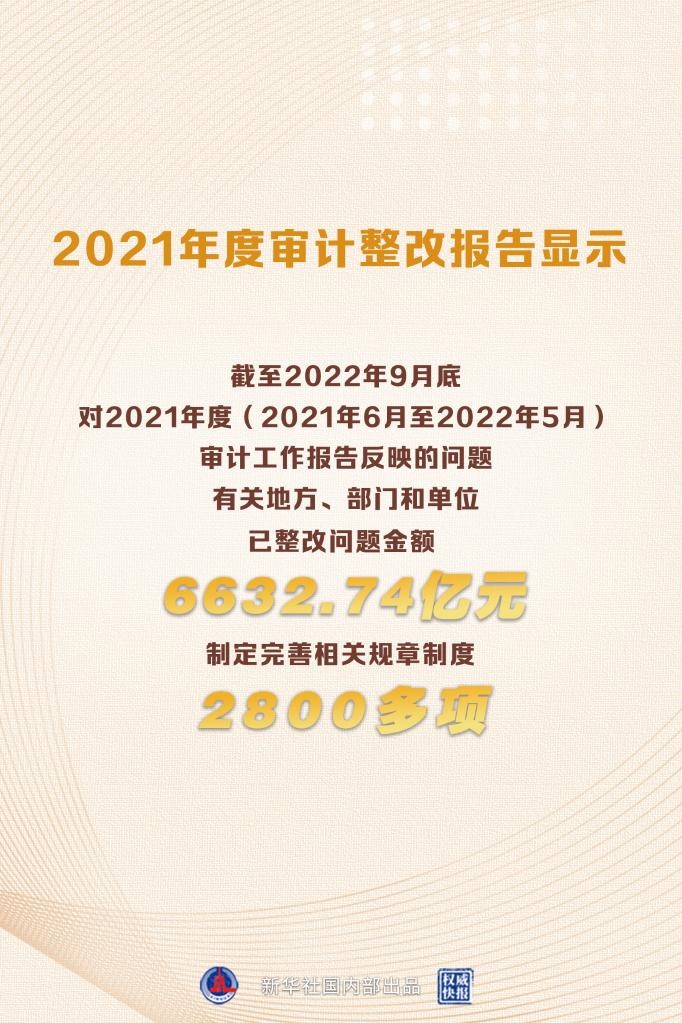 新華社北京12月28日電(記者鄒多為)報(bào)告顯示,截至2022年9月底,對(duì)于2021年度(2021年6月至2022年5月)審計(jì)工作報(bào)告反映的問(wèn)題,有關(guān)地方、部門和單位已整改問(wèn)題金額6632.74億元,制定完善相關(guān)規(guī)章制度2800多項(xiàng),追責(zé)問(wèn)責(zé)1.4萬(wàn)人,糾治了一些阻礙改革發(fā)展和長(zhǎng)期未解決的頑瘴痼疾。