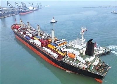 2月23日,中非班輪“塔內(nèi)斯夢想”輪從山東港口煙臺港起航,前往坦桑尼亞達(dá)累斯薩拉姆港。 唐 克攝(人民圖片)