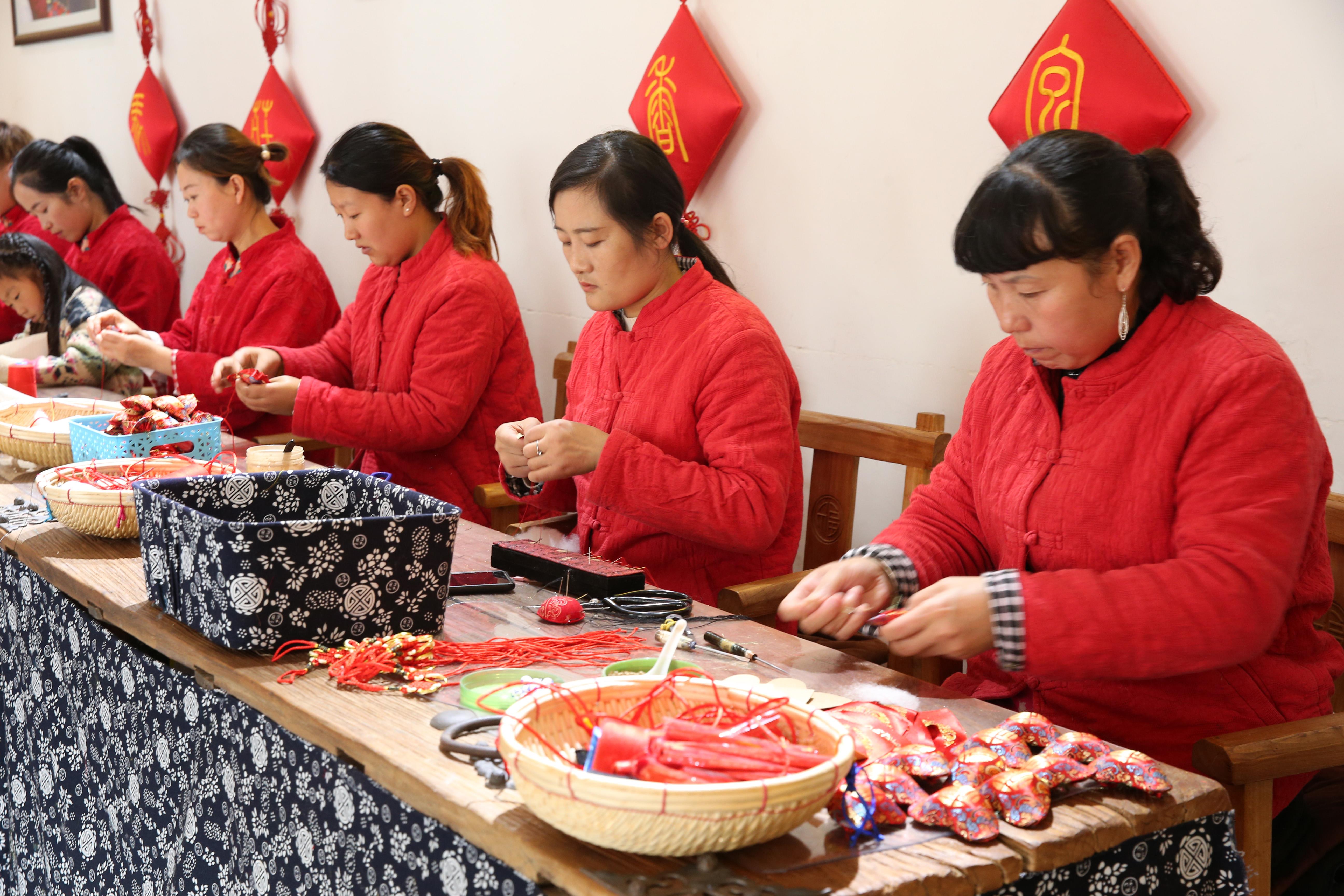 △在化屋村扶貧車(chē)間,隨處可見(jiàn)村民忙碌的身影。車(chē)間里有服裝刺繡、工藝品、蠟染等產(chǎn)品,銷(xiāo)量良好。