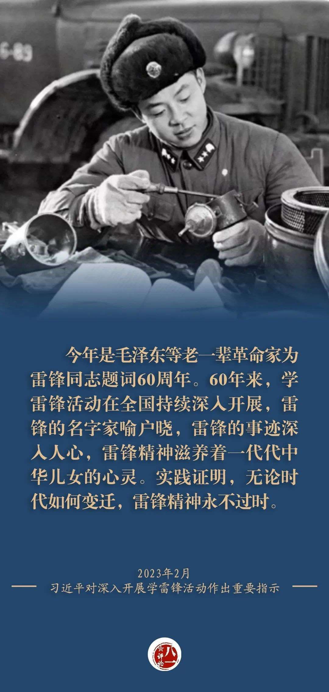 在毛澤東等老一輩革命家題詞60周年之際,習(xí)近平總書(shū)記又專(zhuān)門(mén)對(duì)深入開(kāi)展學(xué)雷鋒活動(dòng)作出重要指示,強(qiáng)調(diào)“無(wú)論時(shí)代如何變遷,雷鋒精神永不過(guò)時(shí)”,要“讓學(xué)雷鋒活動(dòng)融入日常、化作經(jīng)常,讓雷鋒精神在新時(shí)代綻放更加璀璨的光芒”,為新時(shí)代更好弘揚(yáng)雷鋒精神指明了方向。
