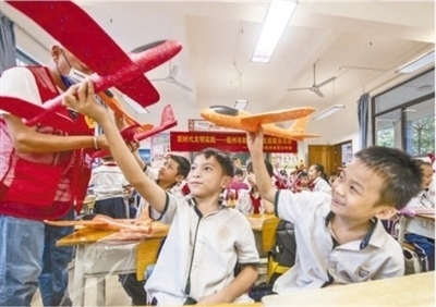 廣西壯族自治區(qū)梧州市的一所小學內(nèi),學生正在上趣味航??萍颊n。何華文攝(影像中國)