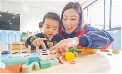 浙江省湖州市德清縣阜溪街道興山未來社區(qū)嬰幼兒照護驛站,幼兒在志愿者指導(dǎo)下拼搭積木。王樹成攝(影像中國)