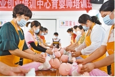 湖北省襄陽市保康縣就業(yè)創(chuàng)業(yè)培訓(xùn)中心,學員在育嬰師培訓(xùn)班上練習新生兒護理技能。楊 韜攝(影像中國)