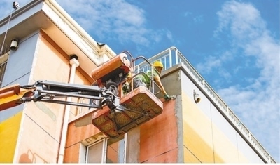 工人在內(nèi)蒙古自治區(qū)呼和浩特市玉泉區(qū)石東路街道一老舊小區(qū)改造升級現(xiàn)場進行外墻真石漆施工作業(yè)。丁根厚攝(人民視覺)