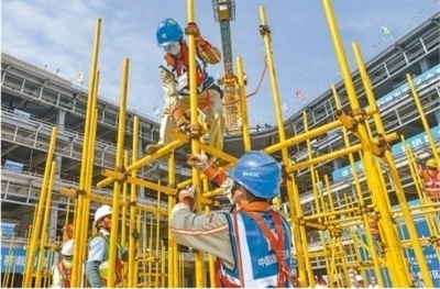 海南省建筑業(yè)職工職業(yè)技能競賽暨質(zhì)量安全現(xiàn)場觀摩交流會現(xiàn)場,建筑工人正在進行架體搭設(shè)競賽??档橇軘z(影像中國)