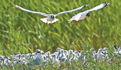 陜西省神木市紅堿淖國家級自然保護區(qū),遺鷗在島上飛翔。 新華社記者 陶 明攝