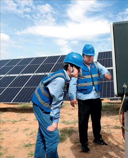▲ 國家電投五凌電力余丁光伏電站職工在檢修設備(2022年8月31日攝) 盧鷹攝
