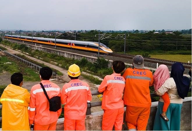 在印度尼西亞萬隆,雅萬高鐵建設(shè)者和當(dāng)?shù)孛癖娪^看高速鐵路綜合檢測車行駛在雅萬高鐵試驗段(無人機(jī)照片)。新華社發(fā)(李培養(yǎng) 攝)