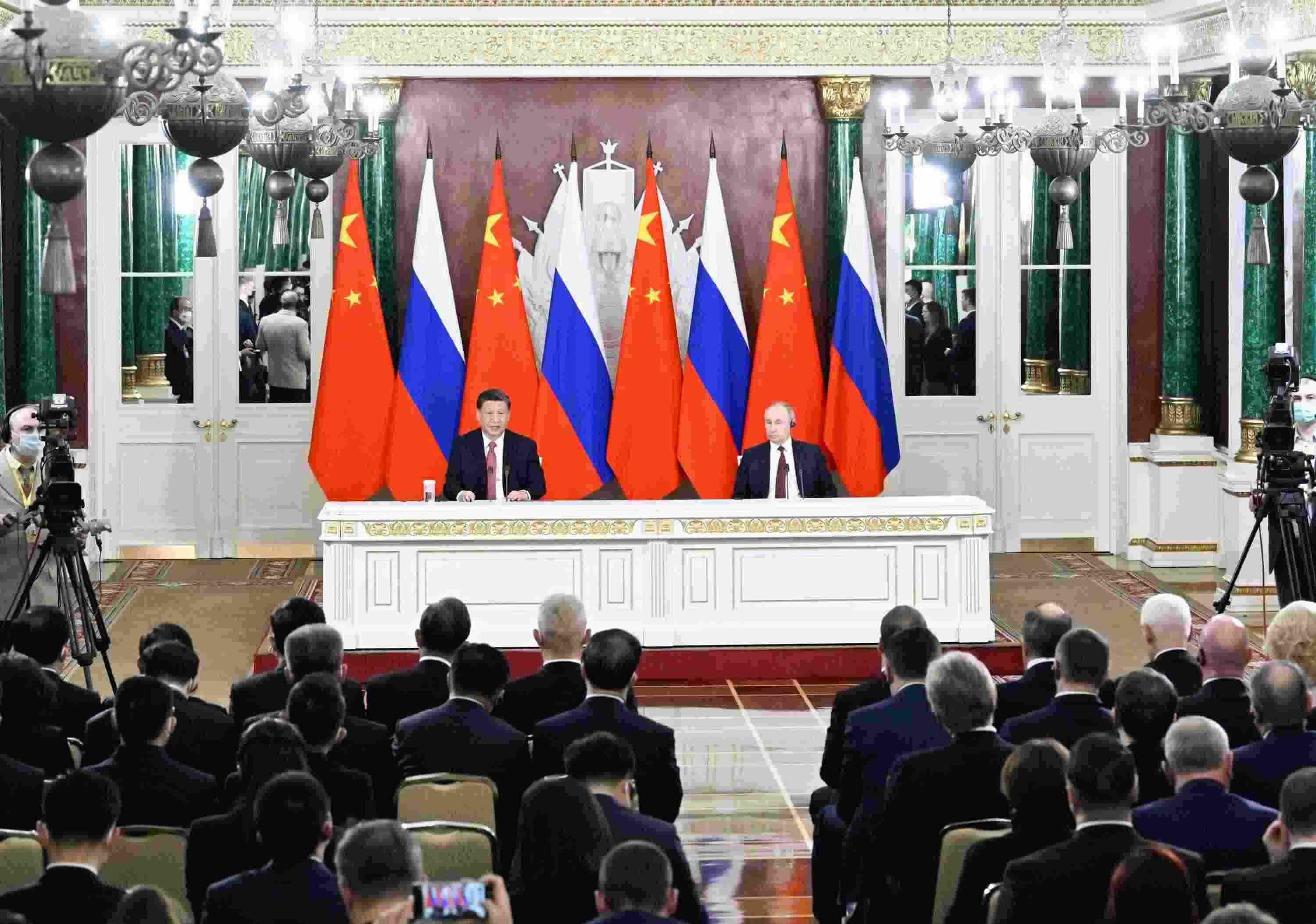 當(dāng)?shù)貢r(shí)間3月21日下午,國家主席習(xí)近平在莫斯科克里姆林宮同俄羅斯總統(tǒng)普京舉行會談。這是會談后,兩國元首共同會見記者。