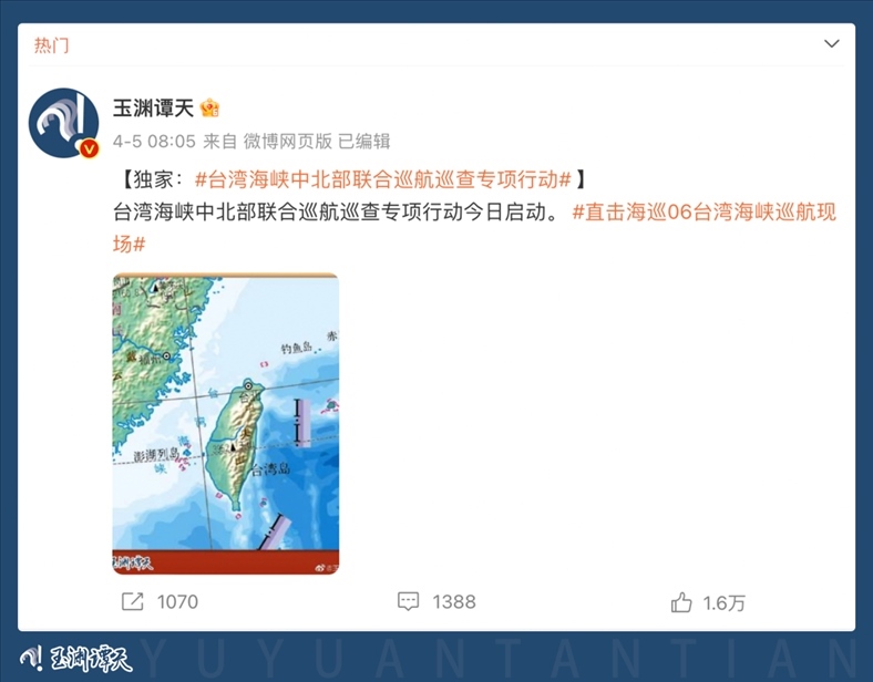 多家主流媒體轉(zhuǎn)發(fā)引用,消息瞬間傳遍全網(wǎng)。90余家臺灣媒體多平臺轉(zhuǎn)發(fā),揣測此次巡航活動及玉淵譚天配圖釋放的信號。臺當(dāng)局就此消息進(jìn)行緊急回應(yīng),美國之音也撰文評論。
