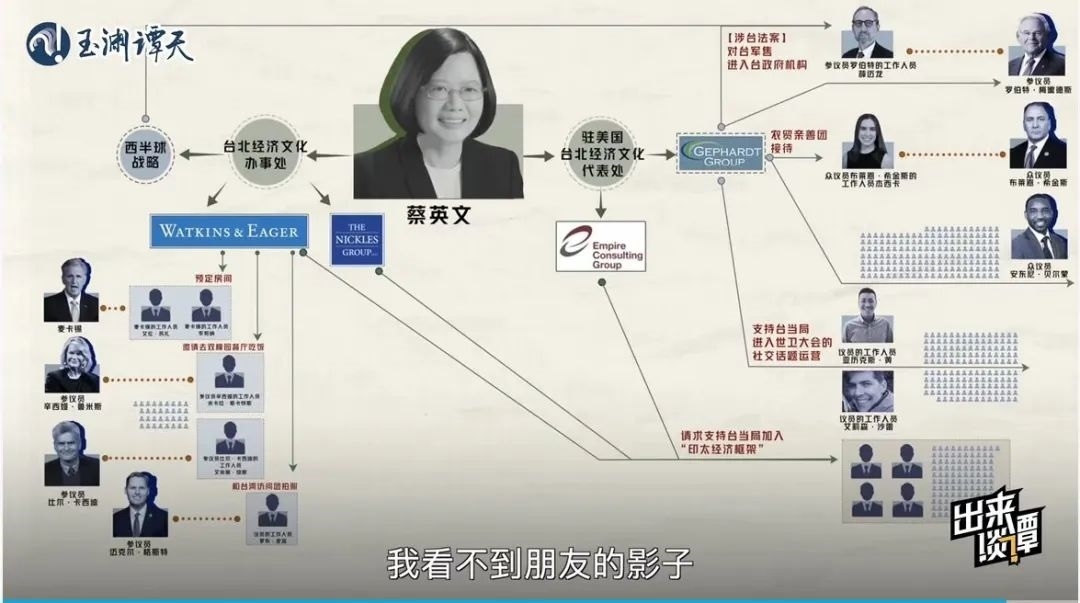 趁熱再打鐵,玉淵譚天繼續(xù)抽絲剝繭,以數(shù)據(jù)視頻《起底!臺當(dāng)局“朋友圈”大公開》深扒臺當(dāng)局近兩年在美國登記在冊的游說方式與對象,用翔實的數(shù)據(jù),揭秘了臺當(dāng)局能接觸到的美國會人員多為邊緣人的真相,結(jié)合送“保護(hù)費”、送“官職”等賣臺行為實錘,讓臺當(dāng)局在所謂“美臺關(guān)系”中的卑微姿態(tài)展露無遺。