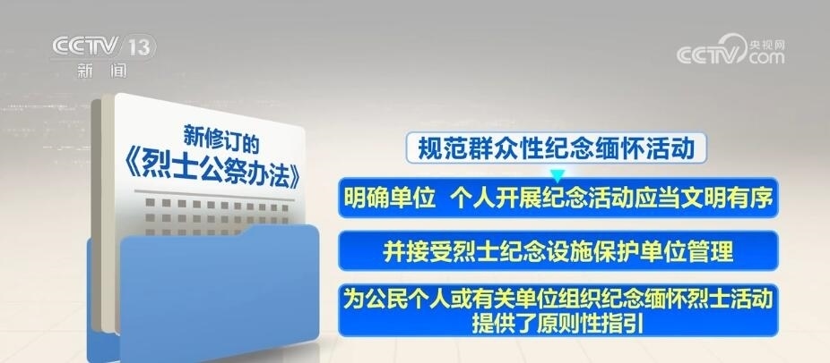 新修訂的《烈士公祭辦法》自5月1日起施行。其中,強(qiáng)調(diào)發(fā)揮公祭活動對青少年的教育作用,要求各級各類學(xué)校組織學(xué)生以適當(dāng)方式參加烈士公祭,加強(qiáng)愛國主義、集體主義、社會主義教育。規(guī)范群眾性紀(jì)念緬懷活動,明確單位、個人開展紀(jì)念活動應(yīng)當(dāng)文明有序,并接受烈士紀(jì)念設(shè)施保護(hù)單位管理,為公民個人或有關(guān)單位組織紀(jì)念緬懷烈士活動提供了原則性指引。