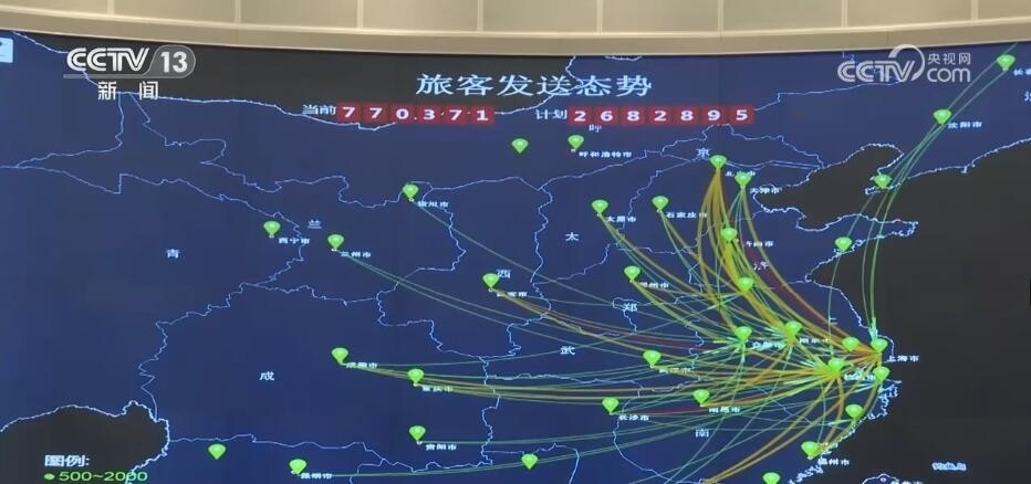 總臺(tái)央視記者 鄭連凱:在調(diào)度大廳的屏幕上,我們可以實(shí)時(shí)看到包括剛剛采訪的虹橋站在內(nèi),整個(gè)長(zhǎng)三角地區(qū)740多座車(chē)站的客流情況,以及13000多公里鐵路線上列車(chē)的運(yùn)行狀態(tài)。而這張圖顯示的是從長(zhǎng)三角連通全國(guó)各地的干線鐵路的繁忙程度,其中紅色的京滬、滬漢榮、滬昆代表著最繁忙,這里的工作人員可以根據(jù)客票需求隨時(shí)調(diào)度,增開(kāi)臨客列車(chē)。