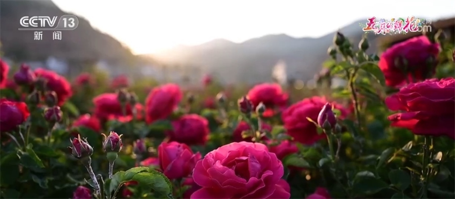 現(xiàn)在我們看到的是位于云南省姚安縣光祿古鎮(zhèn)的數(shù)千畝食用玫瑰。群山環(huán)抱下,滇紅、墨紅等玫瑰花次第綻放。