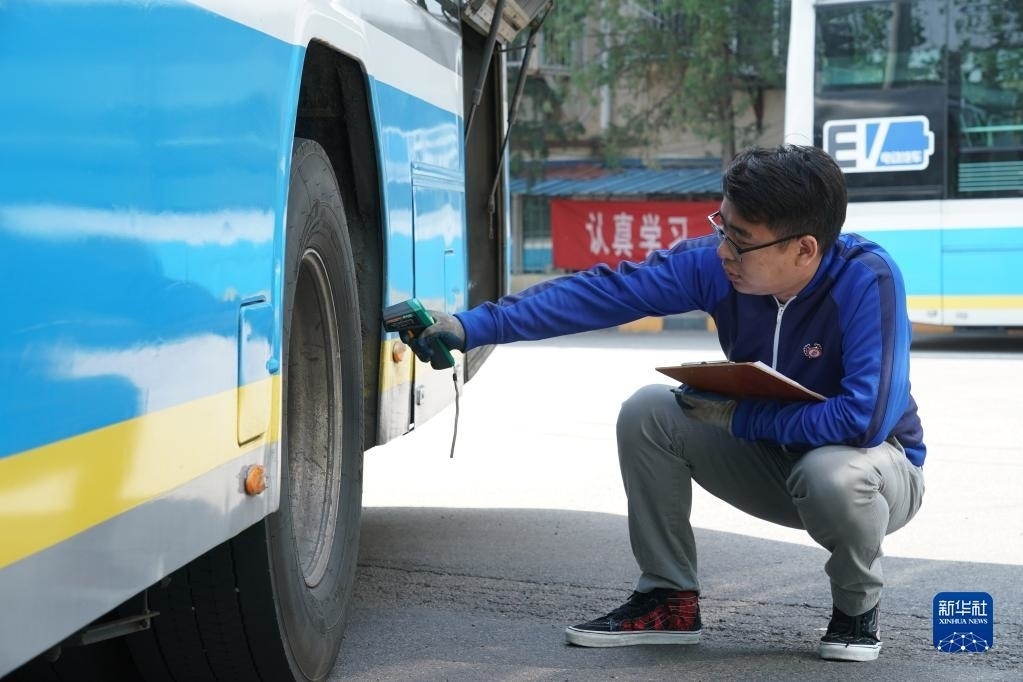 5月1日,在位于北京市朝陽區(qū)的柳芳公交場站,技術(shù)員王陸斌對車輪測溫。