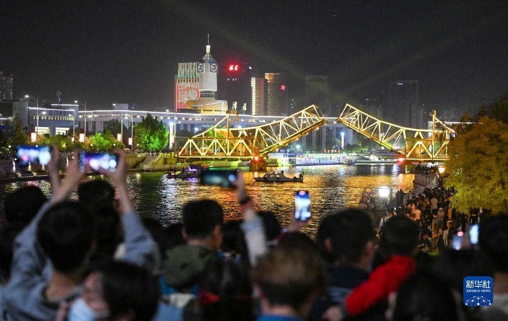 5月1日晚,位于天津海河上的標志性建筑物解放橋橋梁開啟,橋梁開啟角度達到最大角度60度。