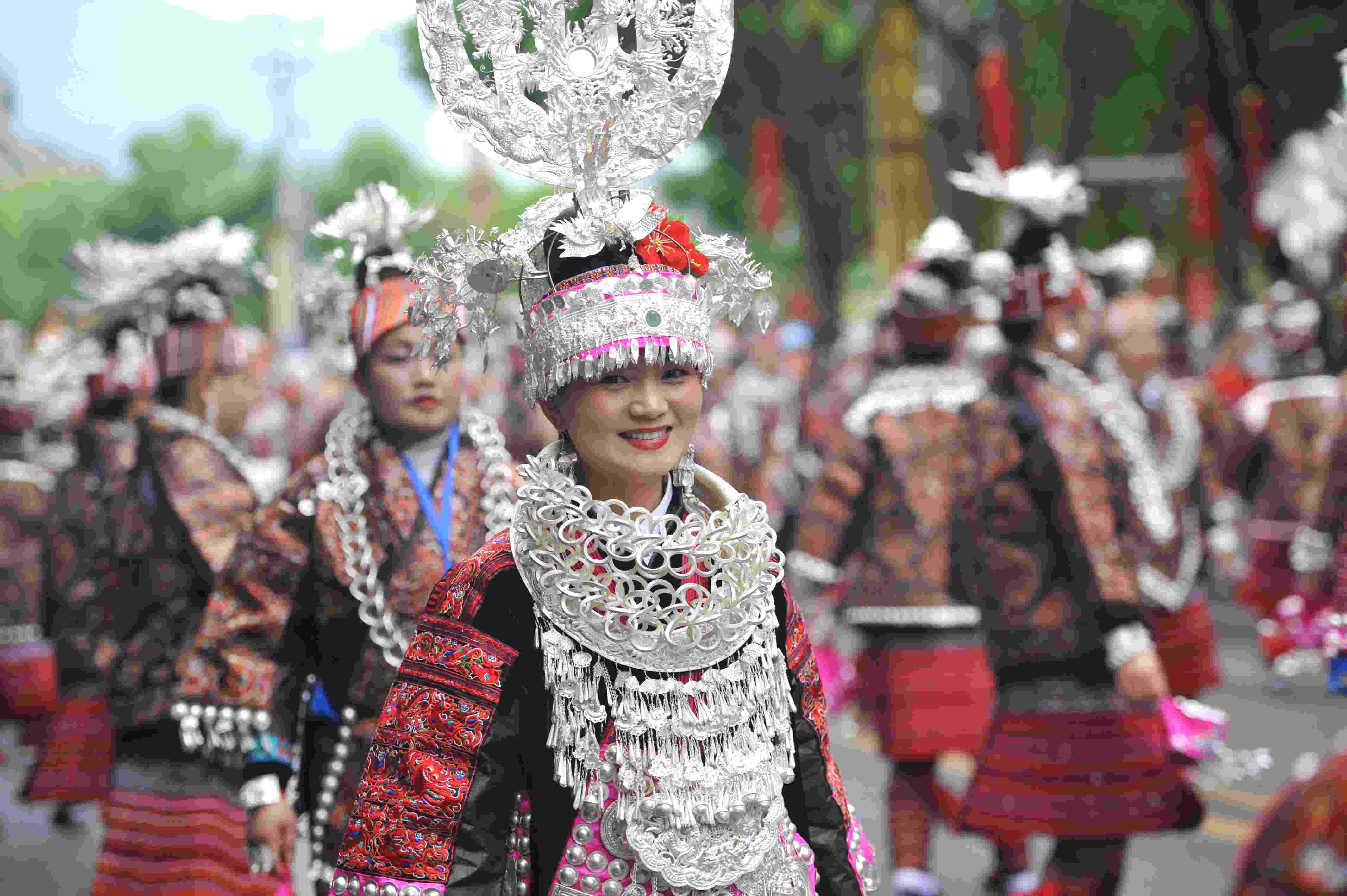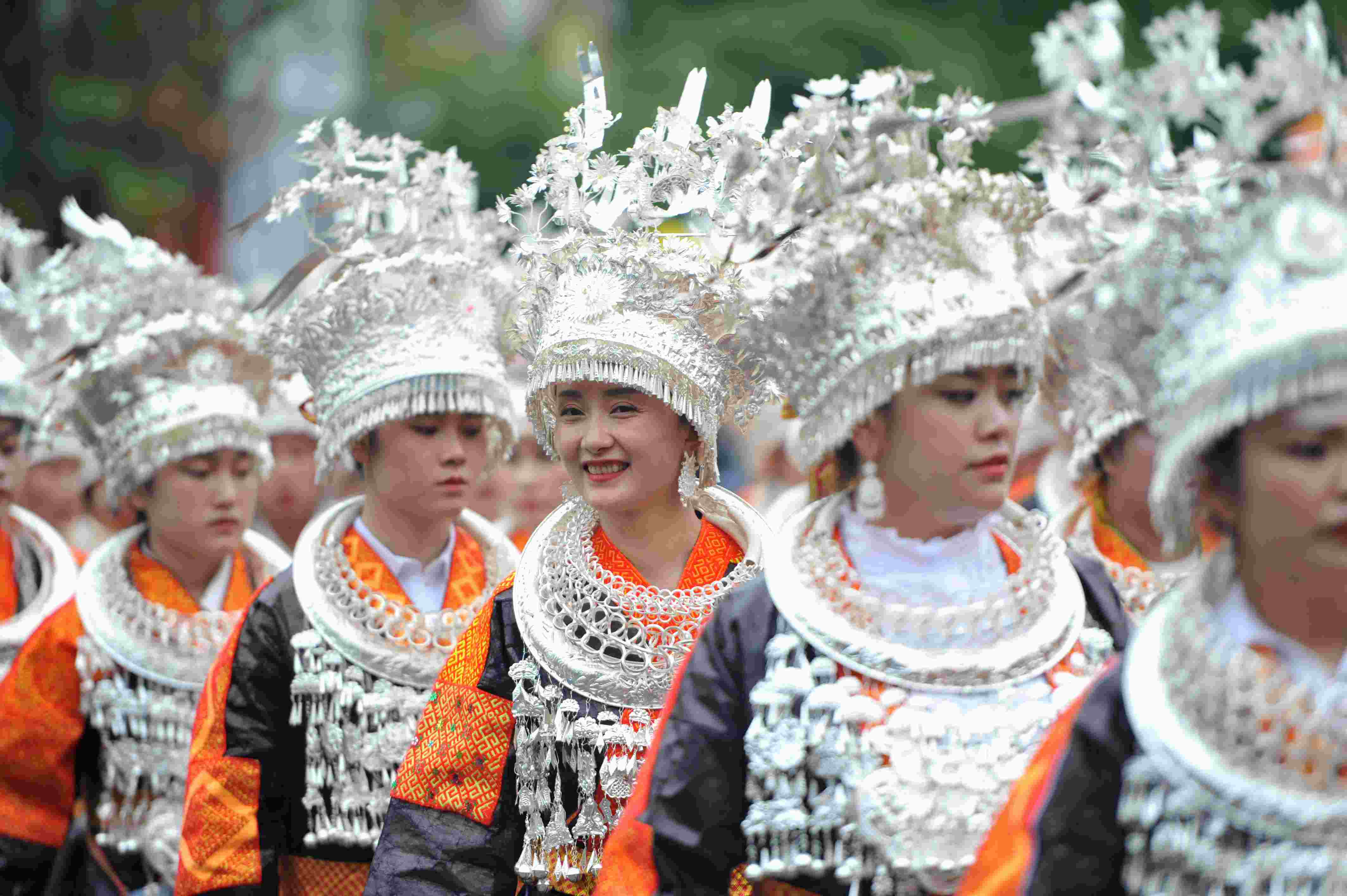 2023年5月2日,苗族同胞在參加“中國臺江2023苗族姊妹節(jié)”盛裝游演。