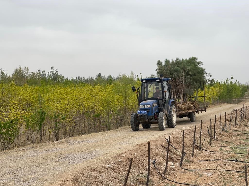寧夏靈武白芨灘國家級(jí)自然保護(hù)區(qū)馬鞍山林場(chǎng)內(nèi),一輛拖拉機(jī)在運(yùn)送樹苗。新華社記者蘇醒 攝
