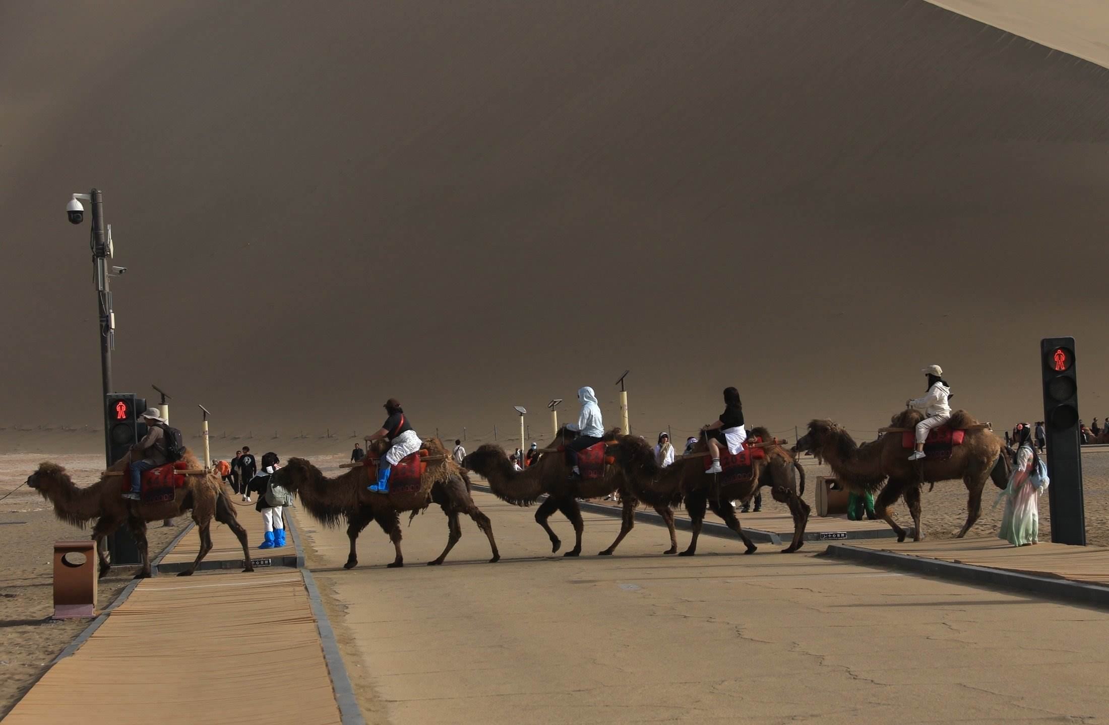 “五一”假期,甘肅省敦煌市鳴沙山月牙泉景區(qū)迎來旅游高峰。設(shè)置在該景區(qū)內(nèi)行人步道和駱駝通道兩個(gè)交叉點(diǎn)的“駱駝紅綠燈”,引導(dǎo)人、車和駱駝?dòng)行蚍至?,不僅確保了景區(qū)交通安全暢通,也成為景區(qū)內(nèi)的“網(wǎng)紅打卡點(diǎn)”之一 。