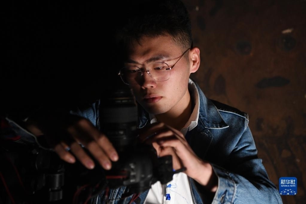 敦煌研究院文物數(shù)字化保護(hù)團(tuán)隊(duì)圖像采集人員熊業(yè)騰在洞窟內(nèi)調(diào)試設(shè)備,準(zhǔn)備進(jìn)行壁畫圖像采集(4月25日攝)。   新華社記者 陳斌 攝
