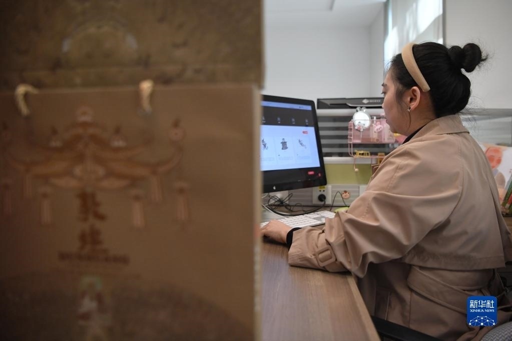 敦煌研究院文物數(shù)字化保護(hù)團(tuán)隊(duì)創(chuàng)意營銷人員廖雪婷在整理文創(chuàng)產(chǎn)品(4月25日攝)。   新華社記者 陳斌 攝